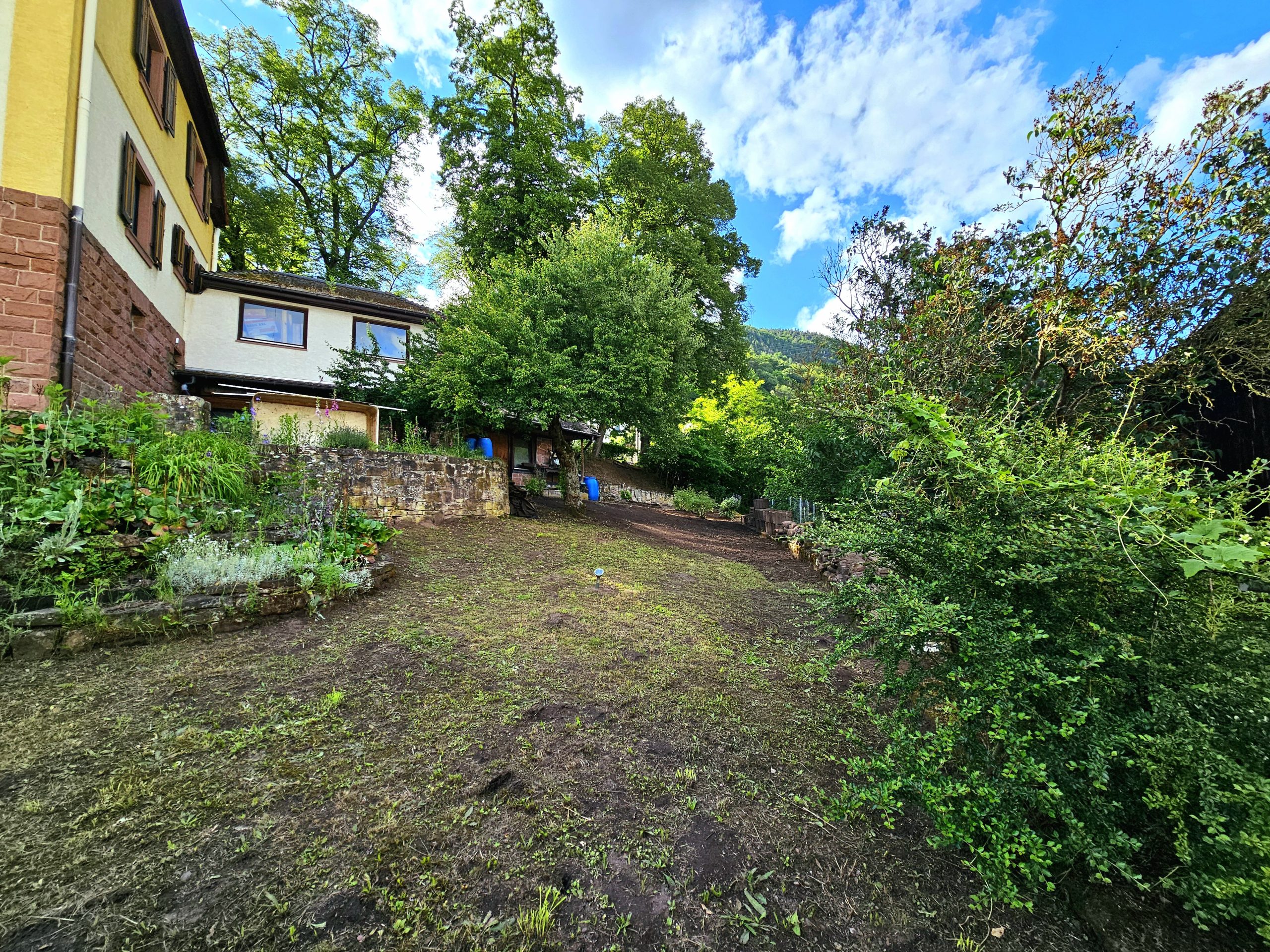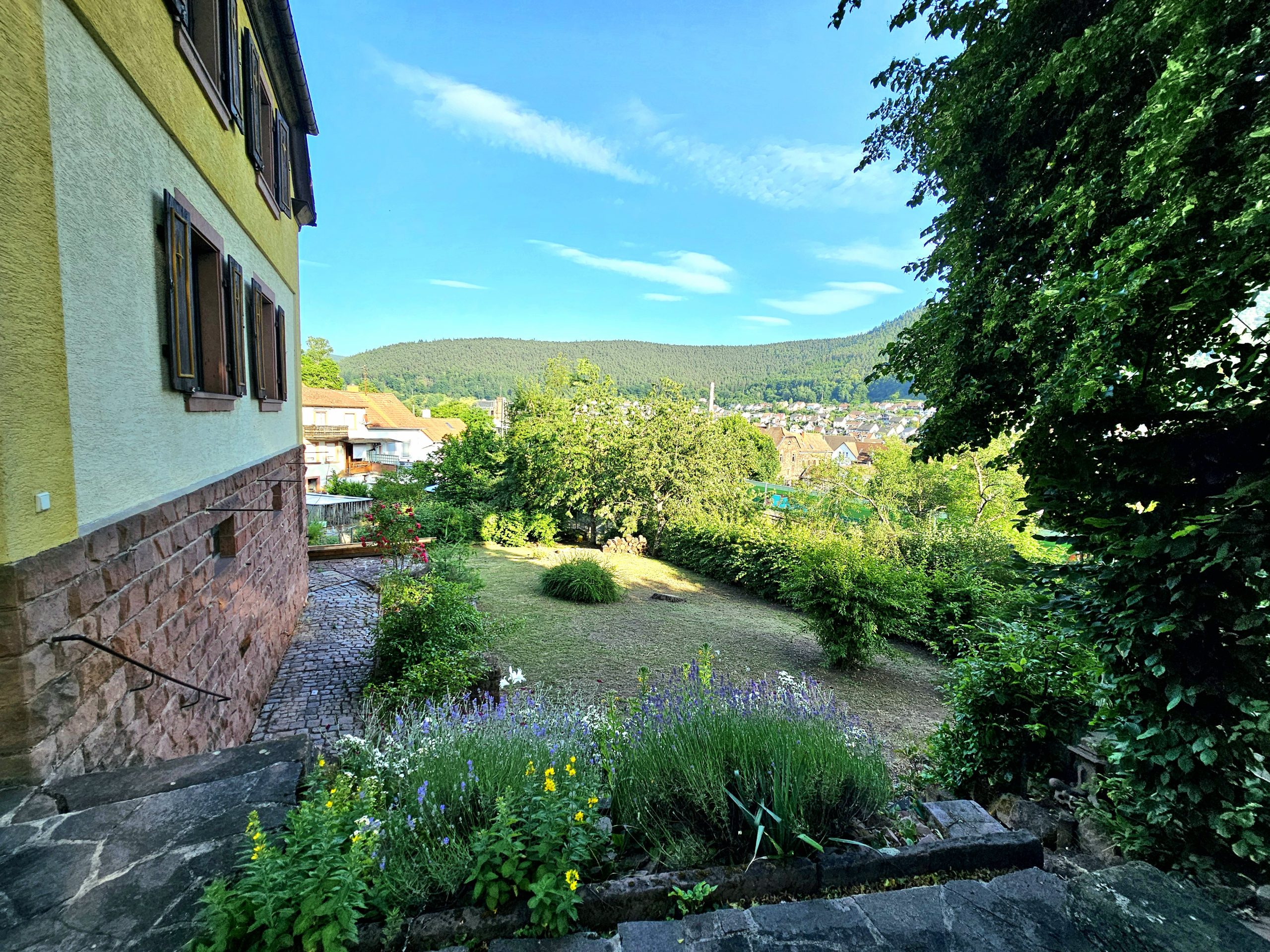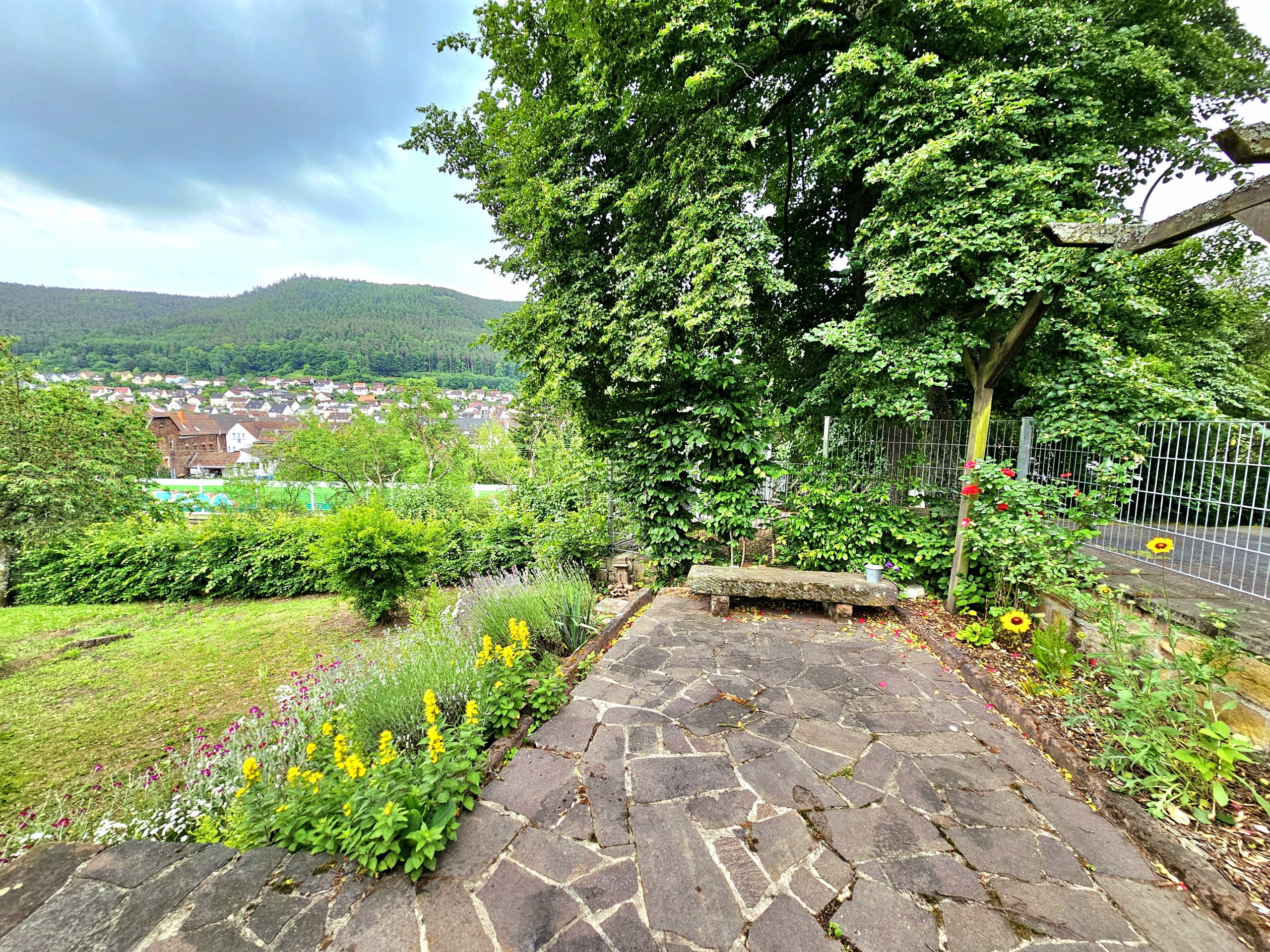 Ein großer Garten bietet Möglichkeit zum Spielen und Entspannen mit Ausblick über Lambrecht und das umliegende Waldgebiet.