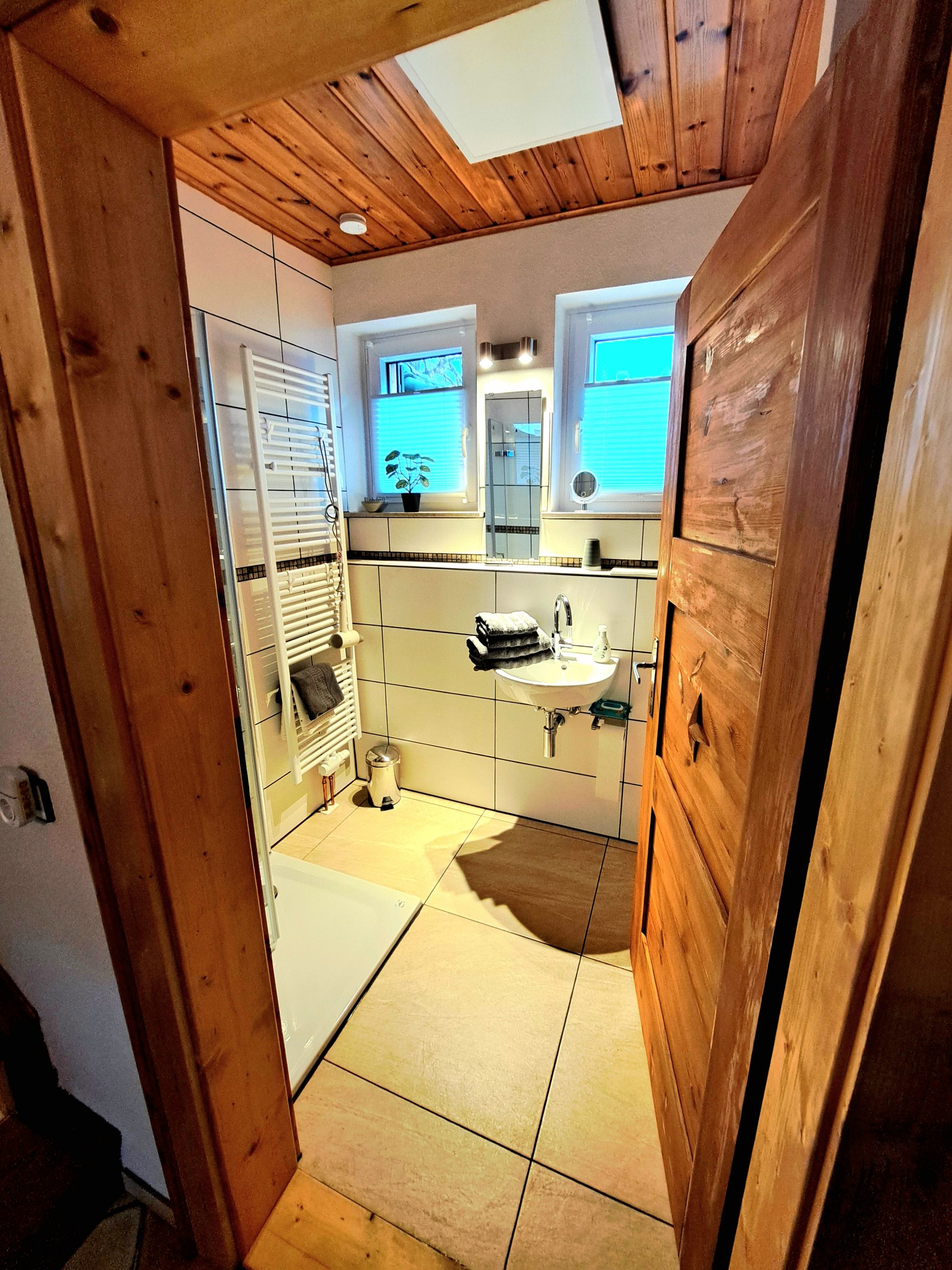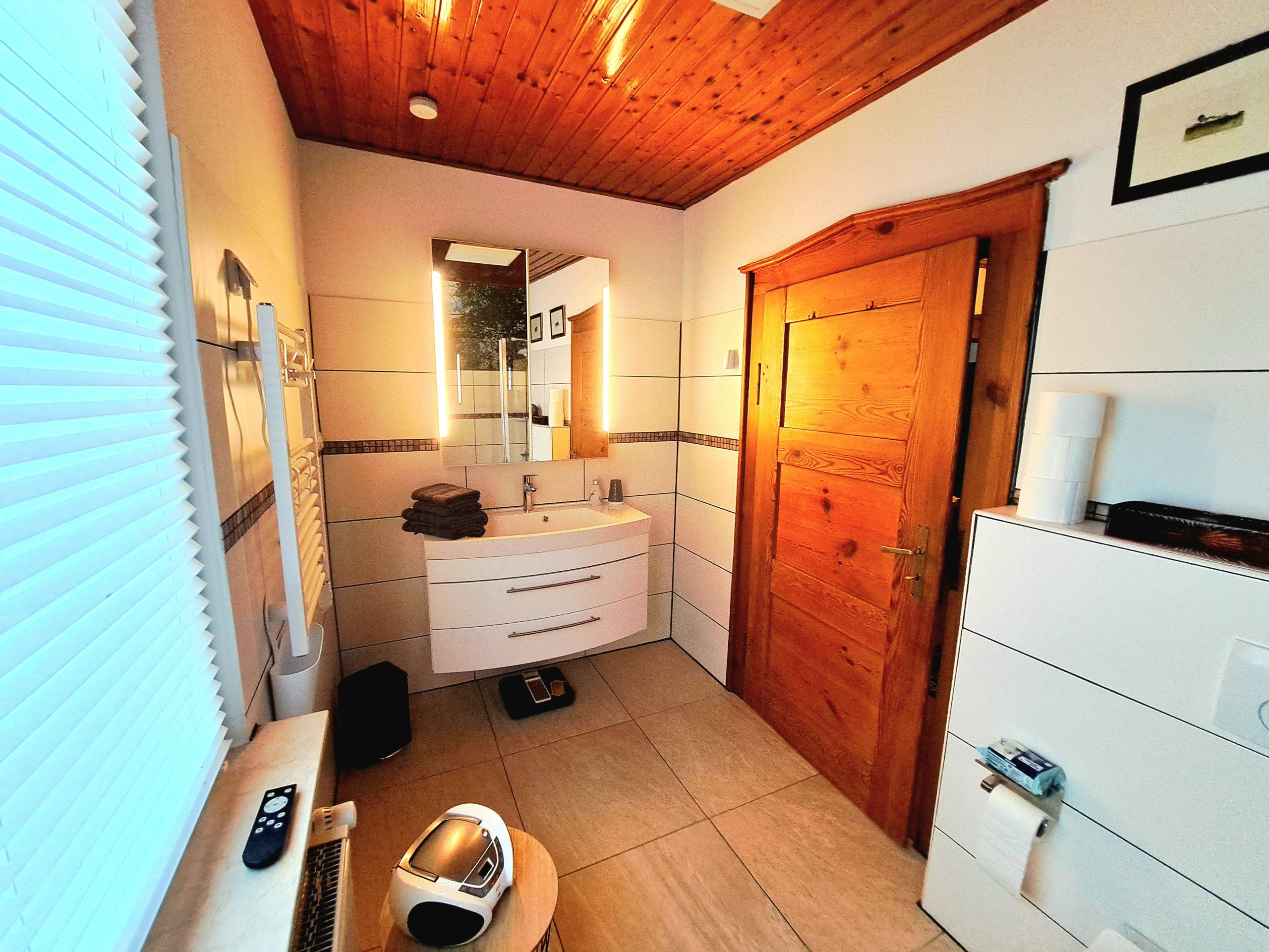Es stehen zwei Bäder mit WC zur Verfügung, eines im Erdgeschoss mit optional buchbarer Waschmaschine und Wäschetrockner und eines im 1. Obergeschoss mit Badewanne, zusätzlich gibt es ein separates Gäste-WC.