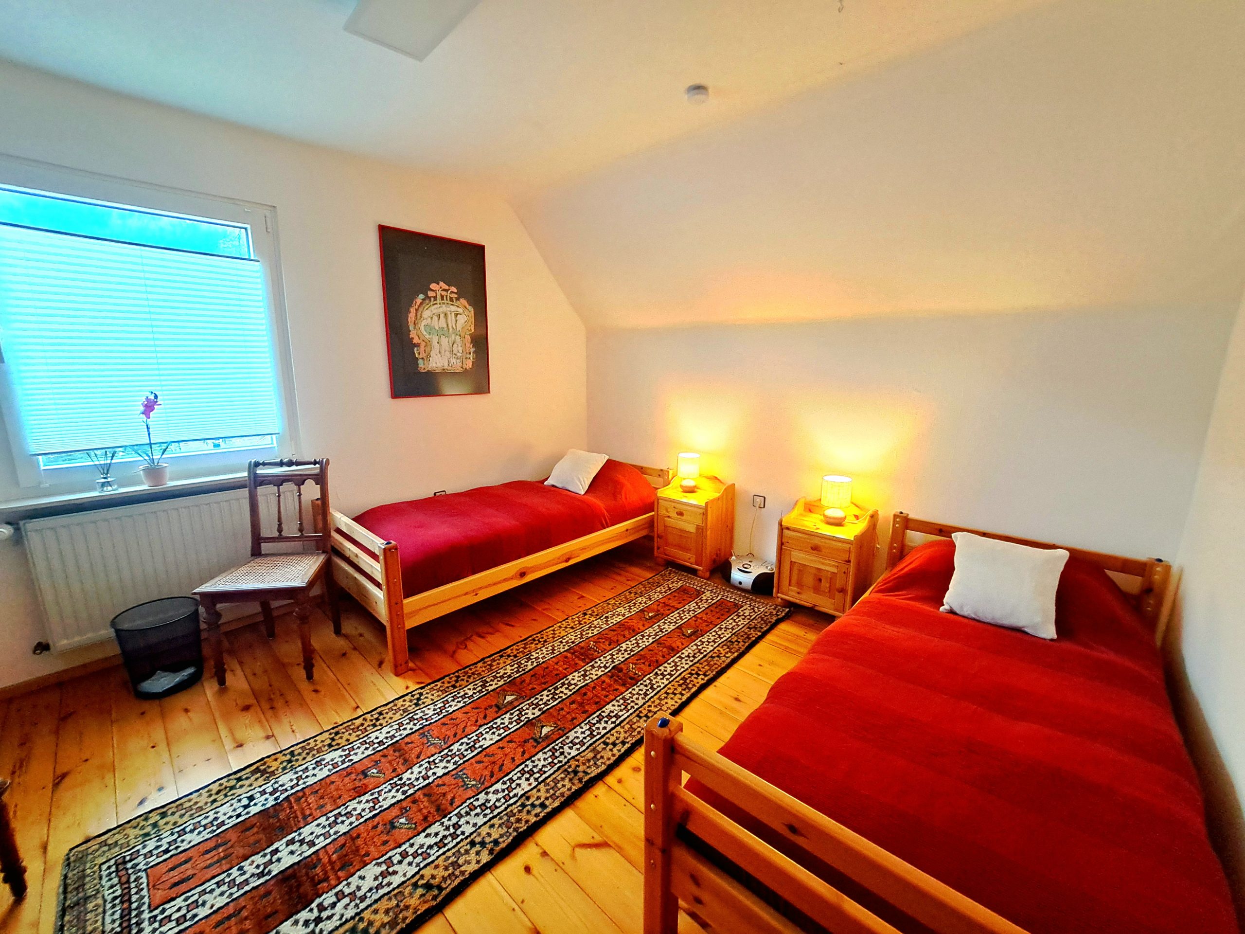 In unserem Haus stehen ein Schlafzimmer mit Doppelbett (180 x 200 cm), eines mit zwei Einzelbetten (90 cm), eines mit zwei zusammenstehenden Einzelbetten (100 cm) und zwei Einzelzimmer (je 100 cm) zur Verfügung. Alle Zimmer verfügen über Sitzmöglichkeiten, Spiegel, Radio und Nachttische mit Licht. Die beiden erstgenannten Schlafzimmer sind durch eine abschließbare Tür miteinander verbunden (z.B. für Eltern mit Kindern). Ein Reisebett für Kinder muss mitgebracht werden.